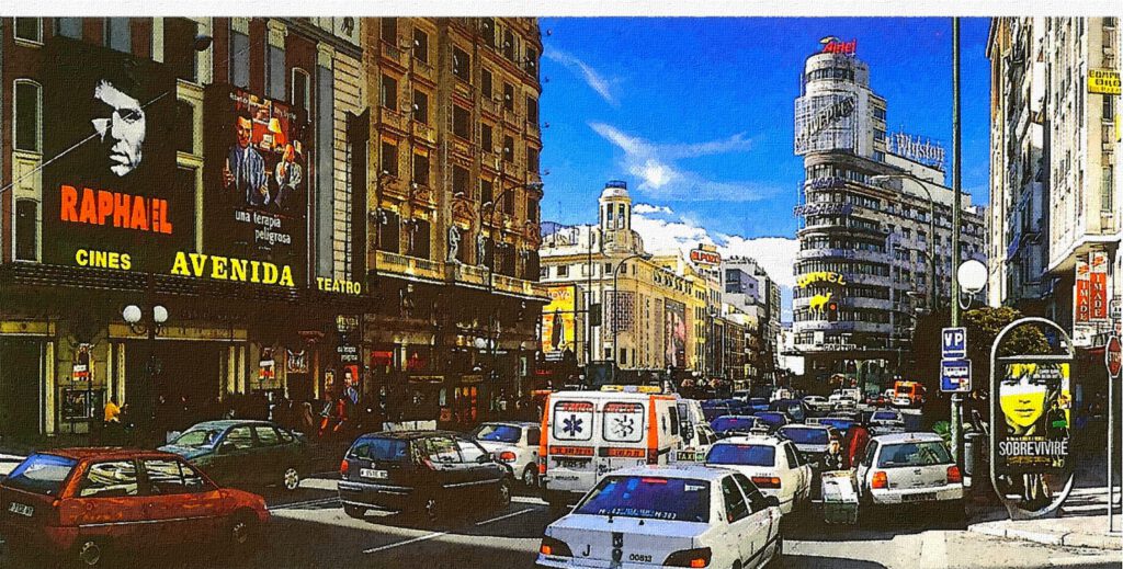 En la obra, el tráfico congestionado, los taxis, las ambulancias y los transeúntes componen una escena llena de energía y realismo. Los carteles luminosos de los cines y teatros, en especial la presencia del icónico Raphael en un anuncio, refuerzan la identidad cultural del lugar y evocan una época donde la Gran Vía era el epicentro del entretenimiento madrileño.